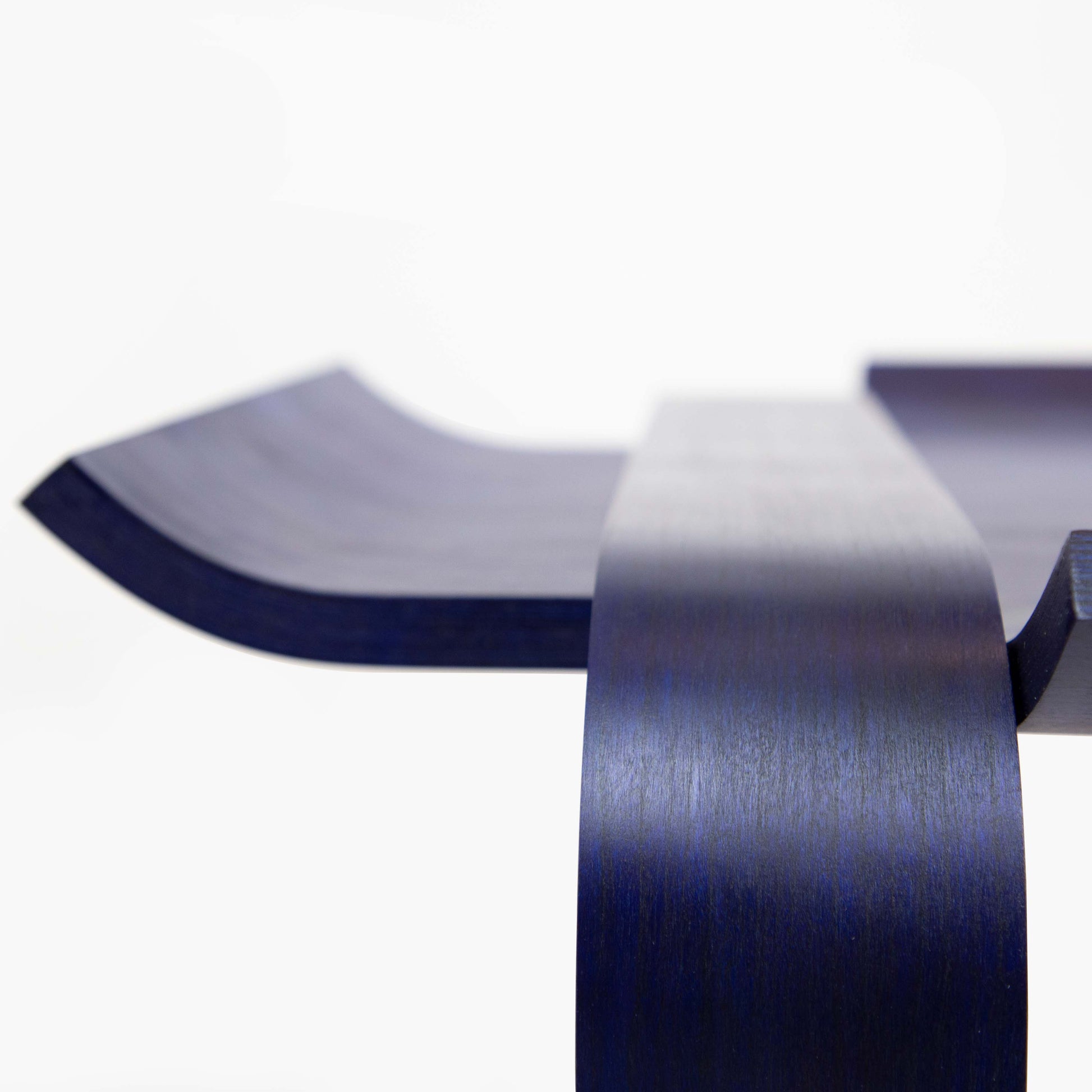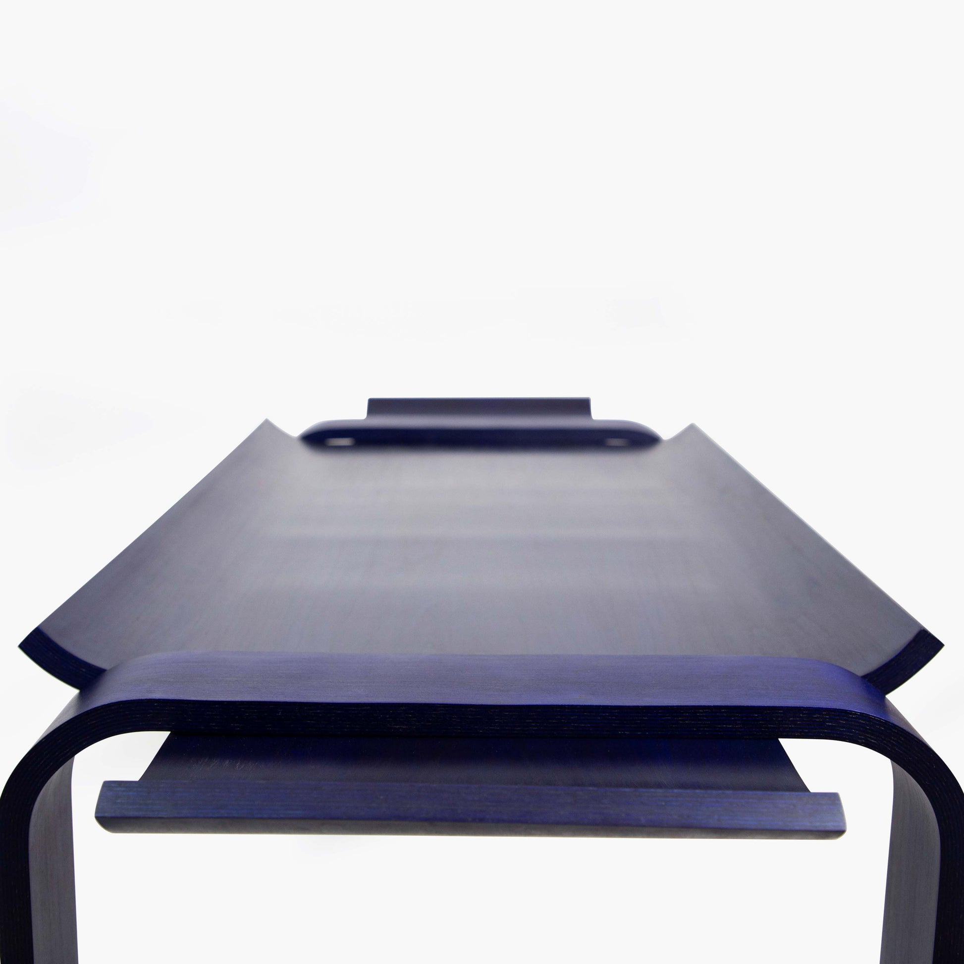 Designed and hand crafted for the Yowie hotel in Philadelphia, the Valley table is a molded plywood coffee table that has been dyed a deep blue while leaving the wood grain visible. The legs are placed over the top to rethink how they can function and add a visual relationship between the two parts.
